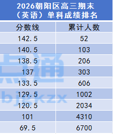 近日,北京市東城、西城、海淀、朝陽等區(qū)的高三年級期末考試成績已陸續(xù)揭曉,備受關注的 “分數(shù)線、區(qū)排名及一分一段表” 也相繼出爐。北京高考在線團隊特意搜集整理了2025-2026學年北京朝陽區(qū)高三期末英語單科成績排名,供考生參考!