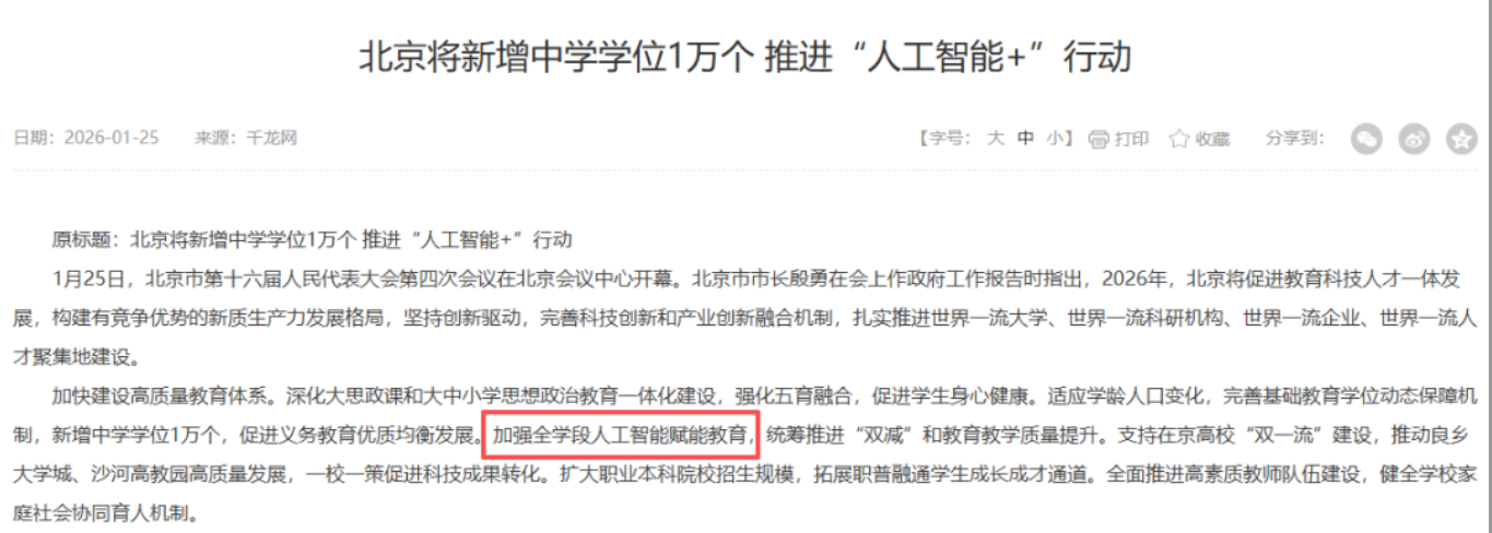 2026年是北京中小學(xué)人工智能教育的“爆發(fā)之年”!根據(jù)北京市政府工作報告,今年將繼續(xù)加強全學(xué)段人工智能賦能教育,統(tǒng)籌推進“雙減”和教育教學(xué)質(zhì)量提升。