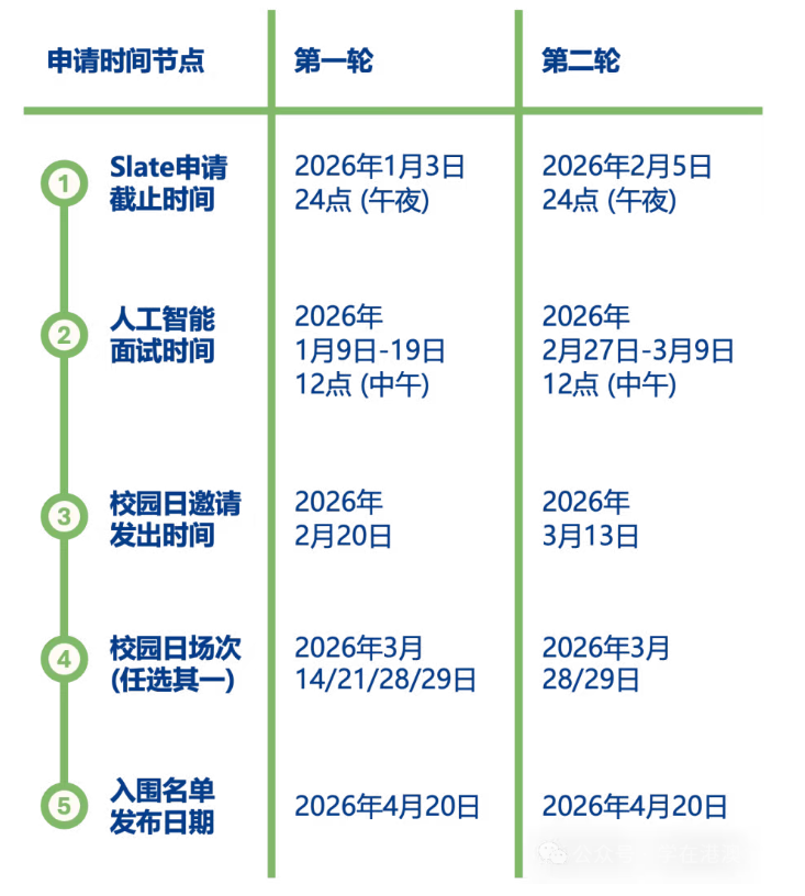 “校園日活動”將安排在2026年3月中下旬的周末多場次分批進行。“校園日活動”之后,本科生錄取流程的自主綜合評估部分完成,中國招生錄取辦公室將于2026年4月下旬以電子郵件形式通知申請者是否成功入圍。學校將按當年全國招生計劃總數(shù)的4倍確定全國入圍名單,該入圍名單將于5月在學校網站進行公示并報送各省 (區(qū)、市) 教育考試院備案和公示。